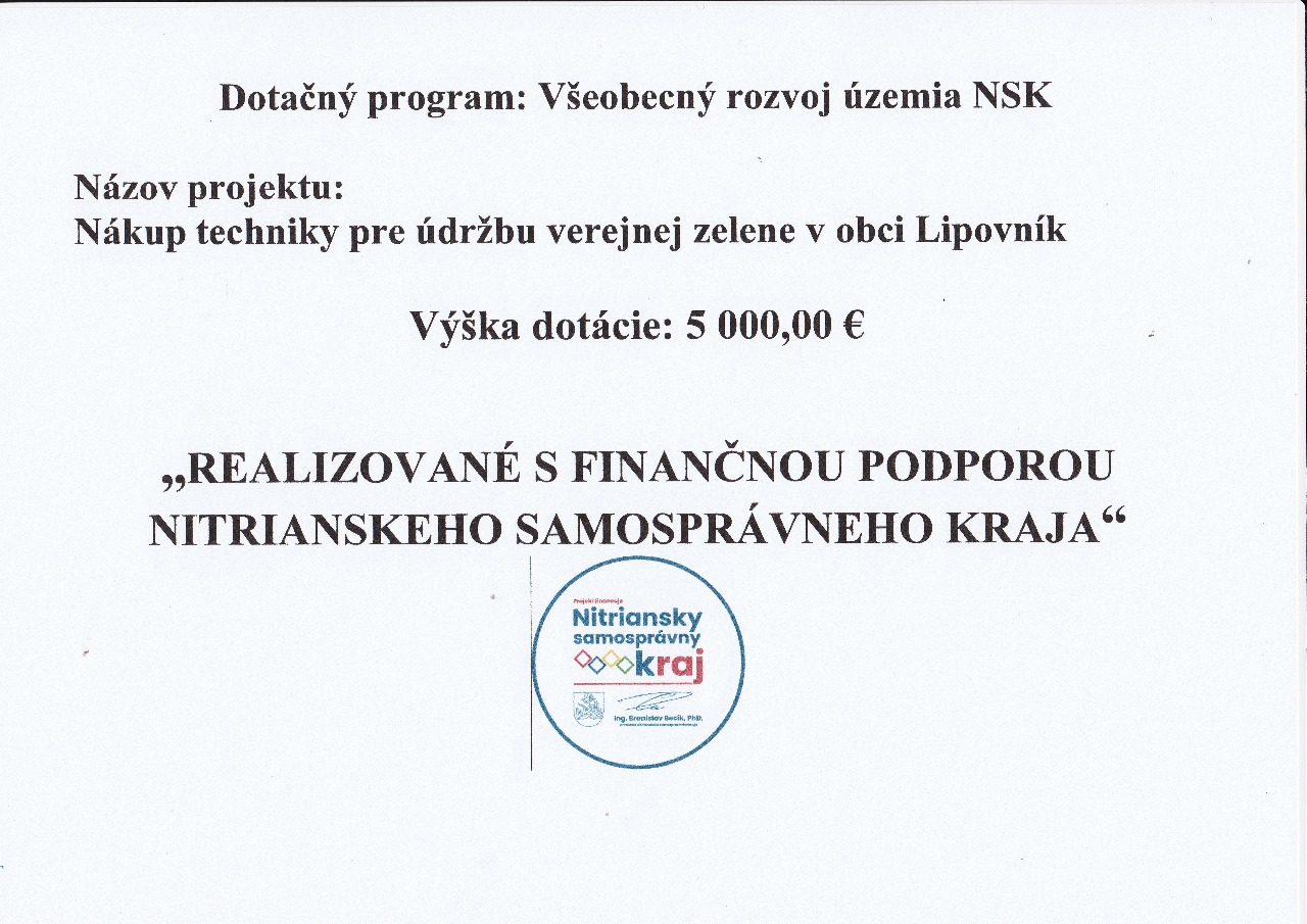 Obec Lipovník oznamuje obyvateľom obce a širokej verejnosti, že s finančnou podporou Nitrianskeho samosprávneho kraja obec Lipovník zakúpila v rámci dotačného programu - Všeobecný rozvoj územia NSK - Projekt: Nákup techniky pre údržbu verejnej zelene v obci Lipovník novú traktorovú kosačku Husqvarna. Obec zakúpením novej traktorovej kosačky zabezpečí kvalitnejšiu údržbu verejnej zelene v obci.