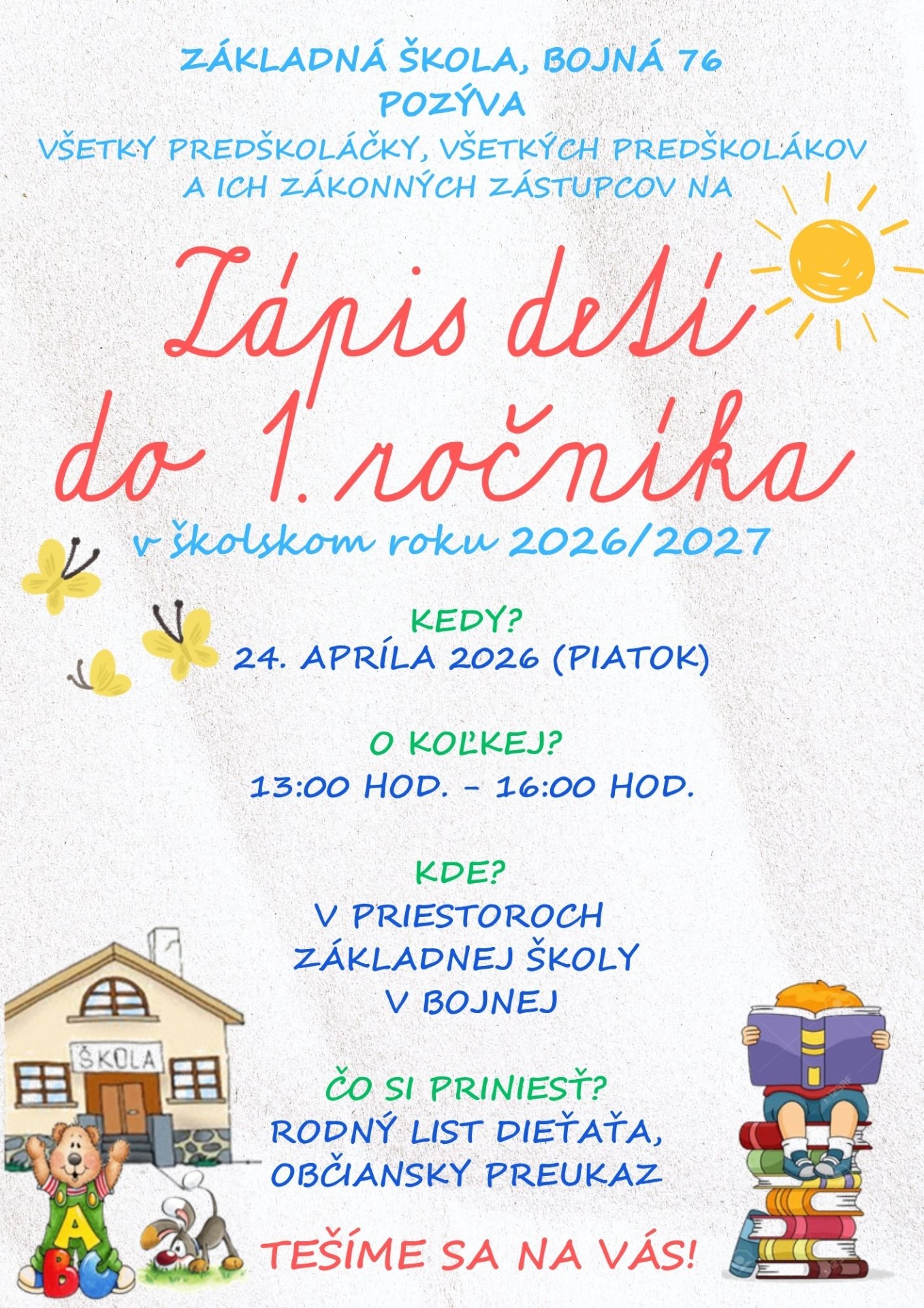 Základná škola Bojná pozýva všetky predškoláčky, všetkých predškolákov a ich zákonných zástupcov na zápis detí do 1. ročníka v školskom roku 2026/2027, ktorý sa uskutoční dňa 24. apríla 2026 t. j. v piatok od 13:00 h. do 16:00 h. v priestoroch ZŠ v Bojnej. Potrebné si priniesť zo sebou rodný list dieťaťa a občiansky preukaz. Tešíme sa na Vás.